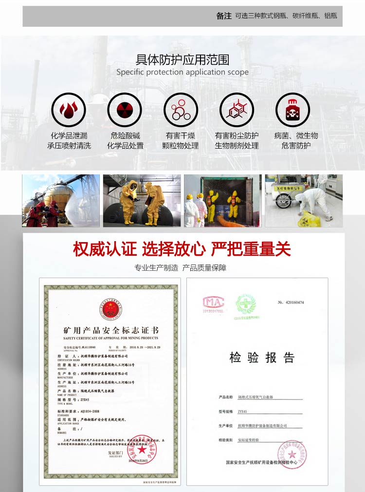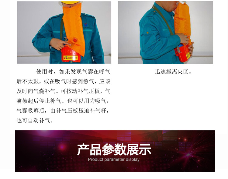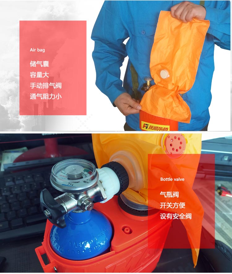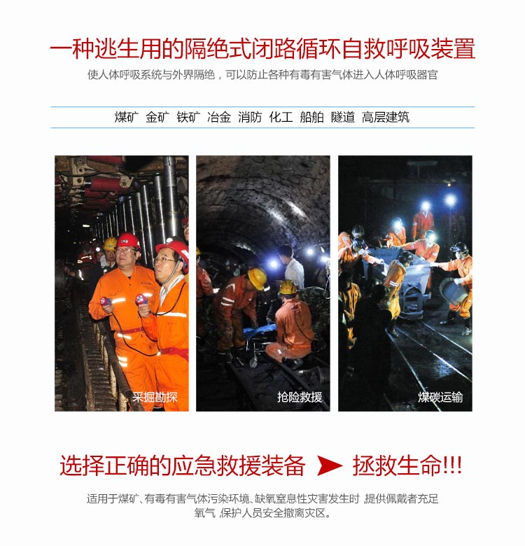 適用范圍:適合在有毒有害氣體污染環(huán)境、或缺氧窒息性災(zāi)害發(fā)生時使用,例如礦山自救逃生、高層樓宇逃生等,同時也可在石油化工、隧道工程等。